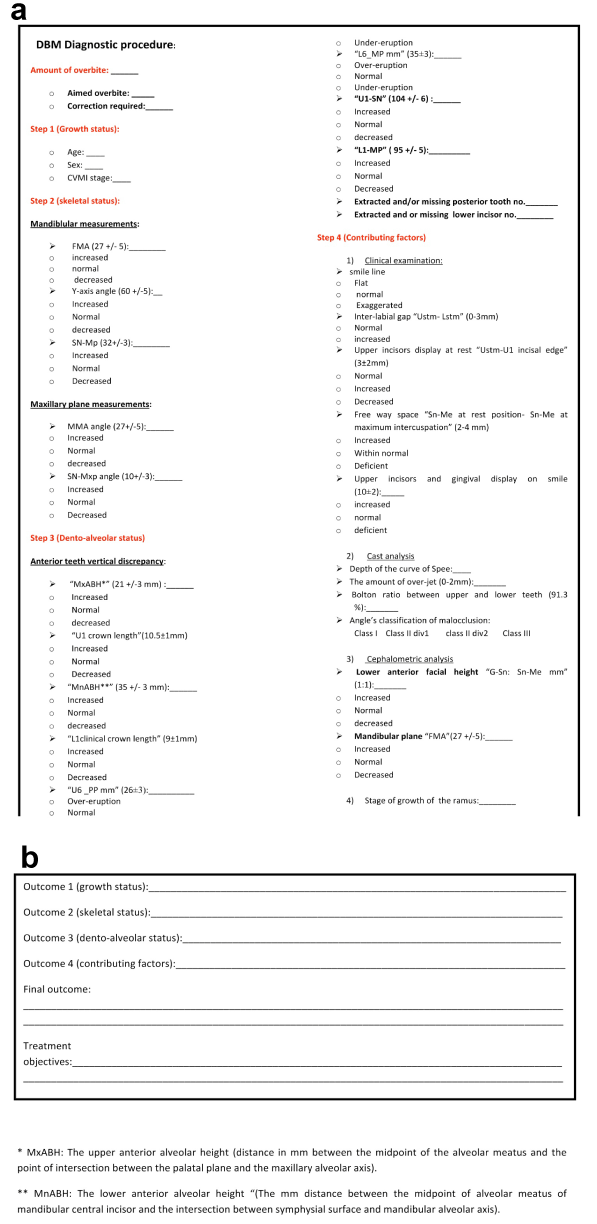 As a clinical application of the above mentioned, the aim of this study is to aid the clinical orthodontist in following a thorough stepwise systematic diagnostic approach in the decision making process of deep bite treatment. A systematic diagnostic sheet is proposed as an aid to the orthodontist in designing the treatment objectives. The causative factors (components) were extracted from lateral cephalometric radiographs and study models of 124 non-growing deep bite cases [3]. The age of the included subject was 14 to 22 years and the selection of the subjects was based on following criteria: