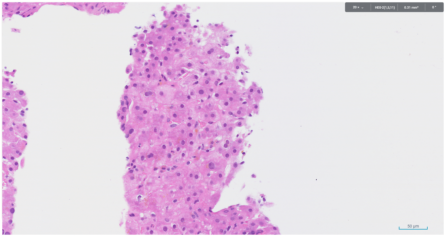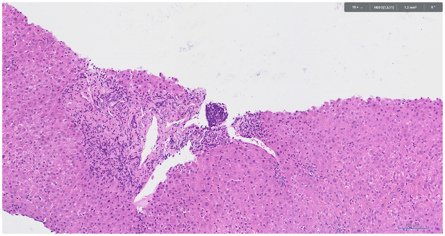A core biopsy taken from the right hepatic lobe showed periportal chronic inflammation without a prominent plasma cell component, and focal interface activity (Figure 1). Mild bile ductular proliferation and mild periportal fibrosis were noted and highlighted with CK7 immunohistochemistry (Figures 2 and 3). There was no evidence of bile duct injury or ductopenia. The hepatic lobules contained scattered chronic inflammatory infiltrate and mild canalicular cholestasis (Figures 4 and 5). Steatosis, confluent necrosis, Mallory-Denk bodies and granulomata were not identified.