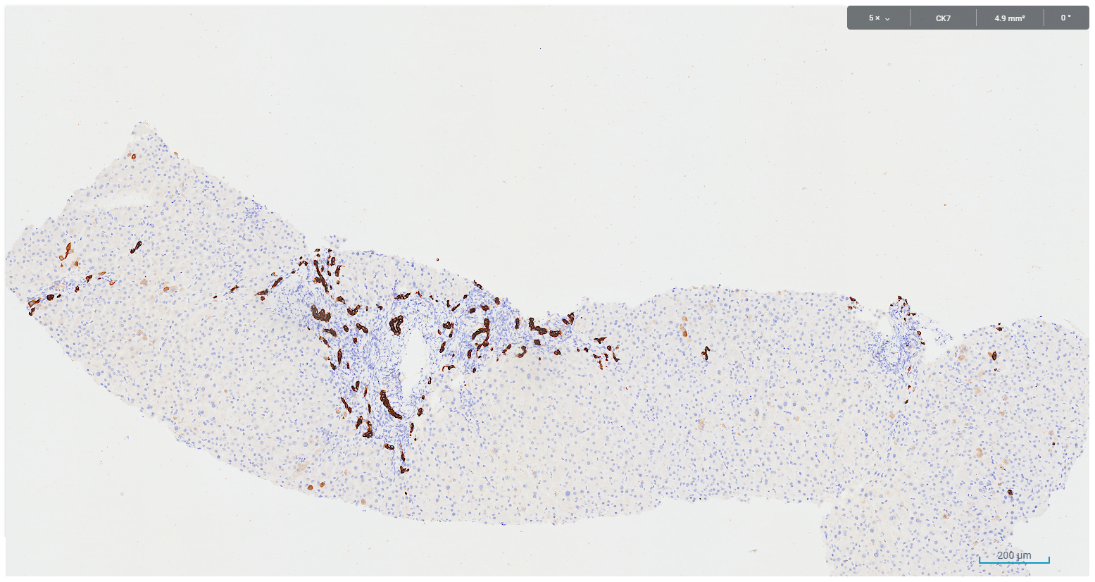 Figure 3. legend: CK7 immunohistochemistry highlights bile ductular reaction at the corresponding site of figure 2
