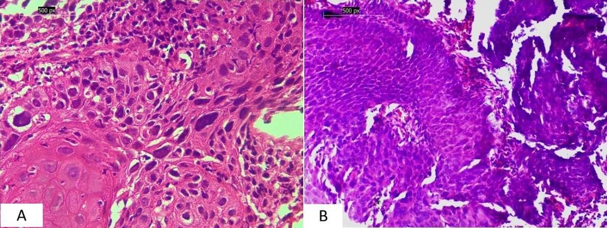 Figure 3. (A – B). Oesophageal squamous cell carcinoma. (A) Well-differentiated squamous cell carcinoma with keratin pearl formation (H&E, 400×). (B) Poorly differentiated squamous cell carcinoma showing marked pleomorphism and high mitotic activity (H&E, 200×)
