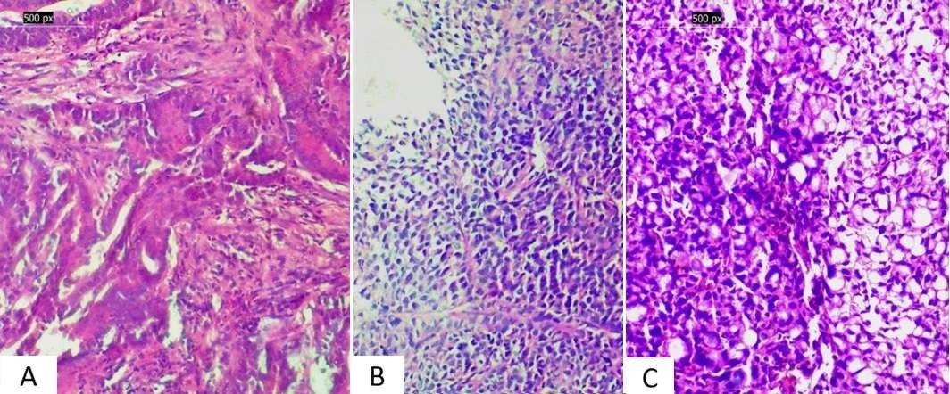 Figure 4. Gastric adenocarcinoma spectrum. (A) Gastric adenocarcinoma showing glandular architecture (H&E, 200×) (B) Poorly cohesive adenocarcinoma with loss of gland formation (H&E, 200×) (C) Signet ring cell carcinoma characterised by intracytoplasmic mucin displacing the nucleus (H&E, 200×)