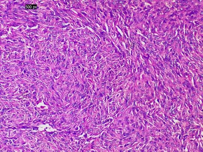 Figure 5. Gastrointestinal stromal tumor (GIST). Proliferation of spindle-shaped cells arranged in fascicles, consistent with GIST (H&E, 200×)