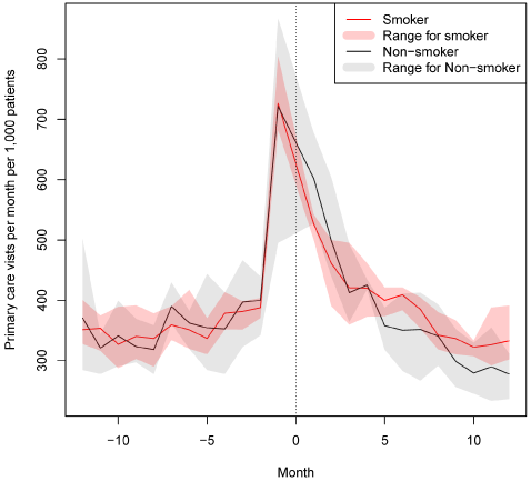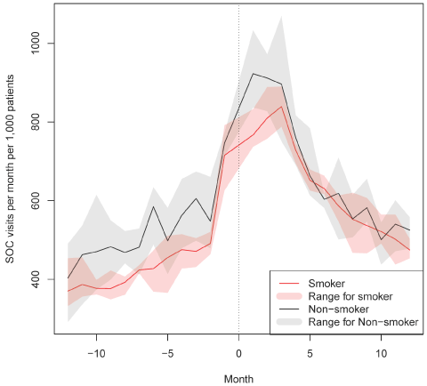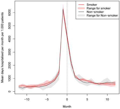 Table 2. Change in utilisation rates (per month per 1,000 patients) prior to and after diagnosis, according to smoking history