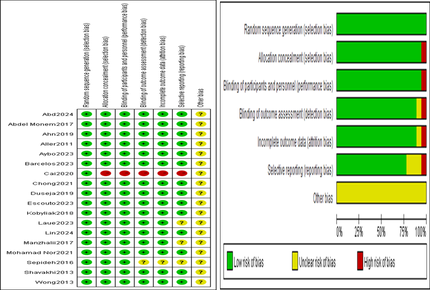 The risk of bias within the 18 studies included in this meta-analysis is summarized in Figure 2, showing the risk of bias graph and the risk of bias summary.