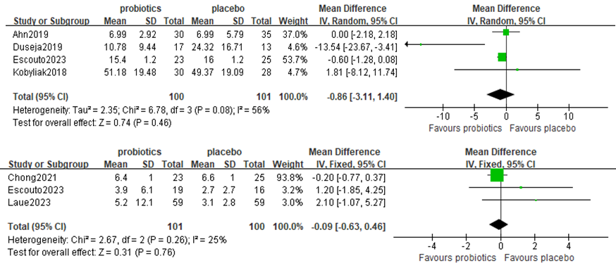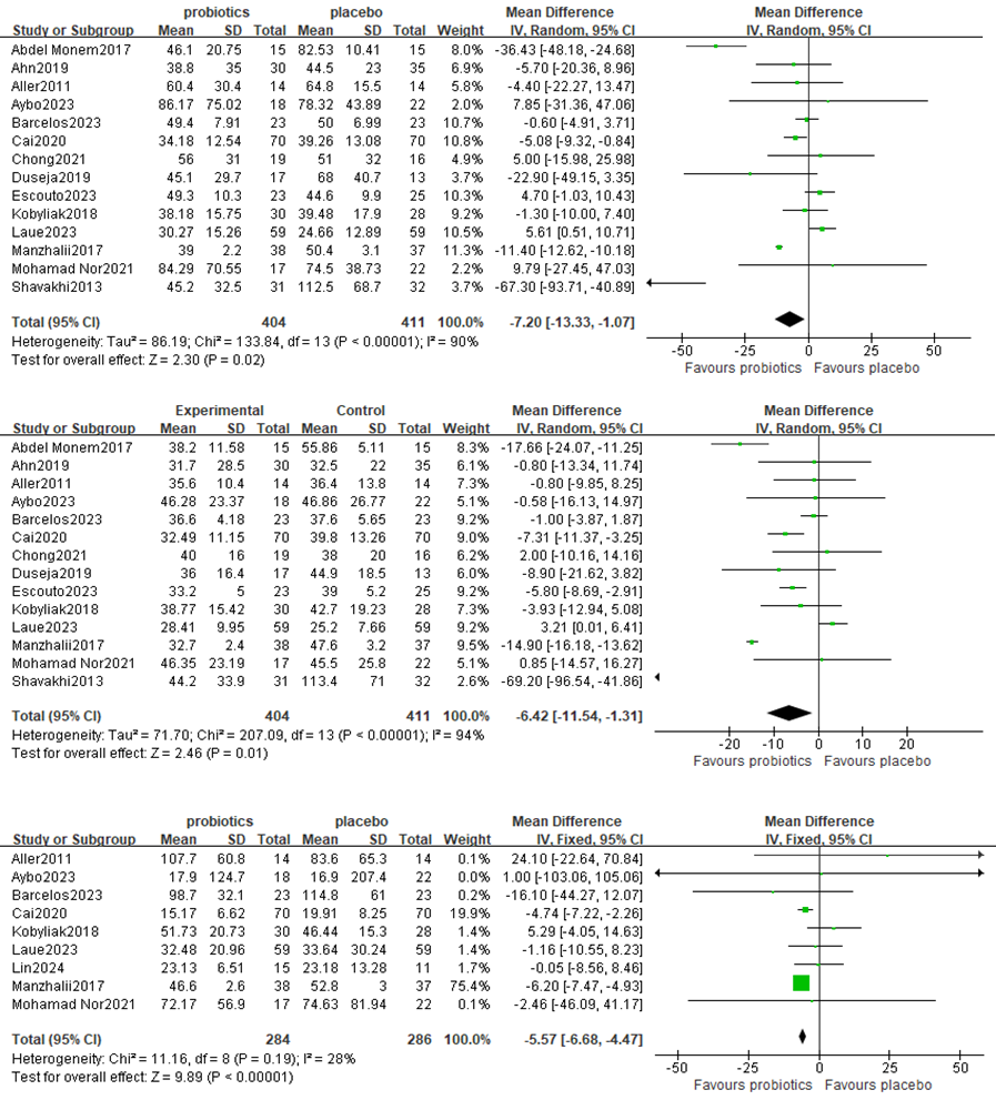 Results: A total of 18 RCTs involving 962 adult patients were included. According to the results of the meta-analysis, probiotic therapy may lower the levels of alanine aminotransferase [mean difference (MD): −9.09(−10.15, −8.03), p<0.00001], aspartate aminotransferase [MD: − 8.52(−9.48, −7.56), p<0.0001], glutamyl transferase [MD: −5.57(−6.68, −4.47), p<0.00001], total cholesterol [MD: − 0.17(−0.32, −0.02), p=0.03], fasting plasma glucose [MD: −0.47(−0.62, −0.33), p<0.00001], and homeostasis model assessment of insulin resistance [MD: −0.65(−1.28, −0.03), p=0.04] in patients with MAFLD compared with those in control individuals. Nonetheless, among MAFLD patients, there was no statistically significant increase in triglyceride levels, tumor necrosis factor-α levels, or C-reactive protein levels.
