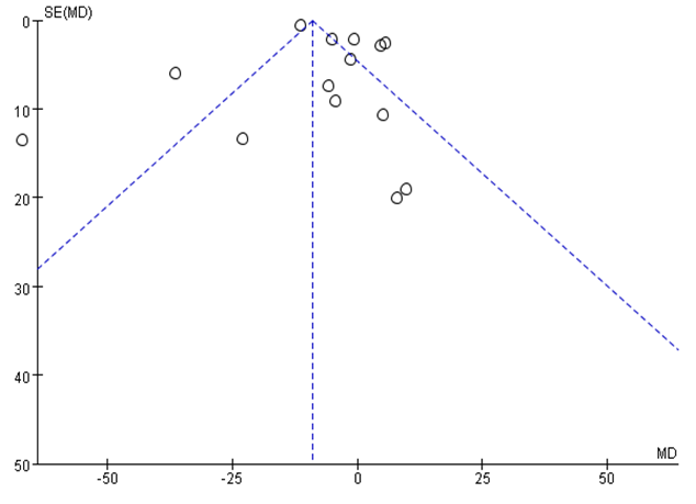 Funnel plot analysis of the 14 RCTs of ALT levels revealed an asymmetric distribution indicating the presence of publication bias (Figure 7).