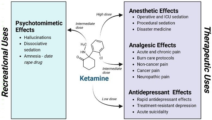 Ketamine is a dissociative anesthetic agent, a compound that induces a state of dissociation between the mind and body of patient [1,2]. It provides multiple levels of anesthesia, from decreased consciousness but awake to fully unconsciousness, which is why ketamine is used as anesthetic agent. The stage between awake and deeply anesthetic, known as dissociation characterized by a level of awareness like when we are dreaming [1,2] (Figure 1).
