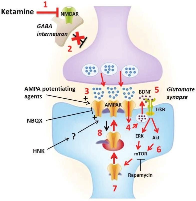 At low doses for depression, ketamine preferentially bind to and inhibit N-methyl-d-aspartate receptors (NMDARs) on γ- aminobutyric acid (GABA) ergic interneurons. This leading to reduced excitability of these inhibitory interneurons, which causes disinhibition of glutamatergic neurons. With increased depolarization of the presynaptic neuron leads to a surge of glutamate release [5,6] (Figure 2).