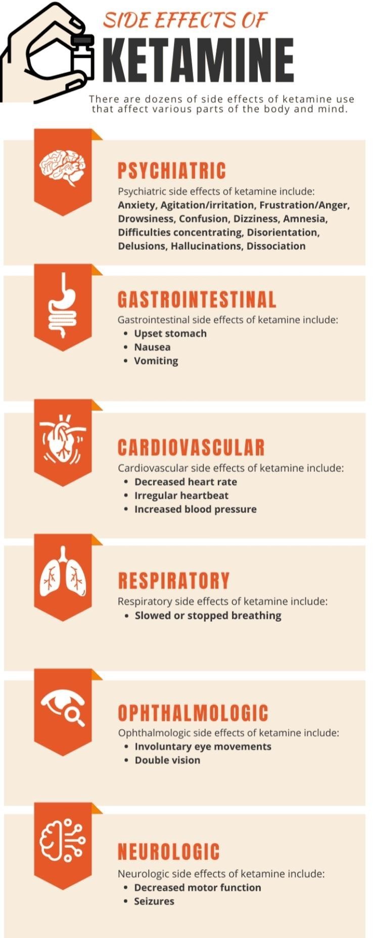 - Psychiatric side effects of ketamine include: Anxiety, Agitation or irritation, Frustration or anger, Drowsiness, Confusion, Dizziness, Amnesia, Difficulties concentrating, Disorientation, Delusions, Hallucinations, and Dissociation.