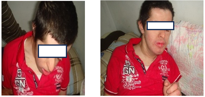 We report the case of a 21-year-old man with Down syndrome and psychomotor delay, previously diagnosed with KD at the age of 16. The patient presented again, four years later, with fever (39–40 °C), scarlatiniform rash, oedema of the hands and feet (Figure 1), strawberry tongue, erythematous and dry oral mucosa, and cervical lymphadenopathy (Figure 2). Cardiac assessment, including ECG and echocardiography, was normal during both admissions [4]. Laboratory findings at the first hospitalization showed hepatic cytolysis, cholestasis, normocytic hypochromic anaemia, renal impairment (MDRD clearance 46 ml/min), elevated CRP (98 mg/L), and negative HIV, CMV, EBV and Covid 19 serologies. Similar results were observed at the second hospitalization, except for normal liver function tests. The patient was treated with aspirin and intravenous immunoglobulin (IVIG), administered late (day 25) during the first episode and earlier (day 7) during the recurrence. The clinical and biological course was favourable in both episodes.
