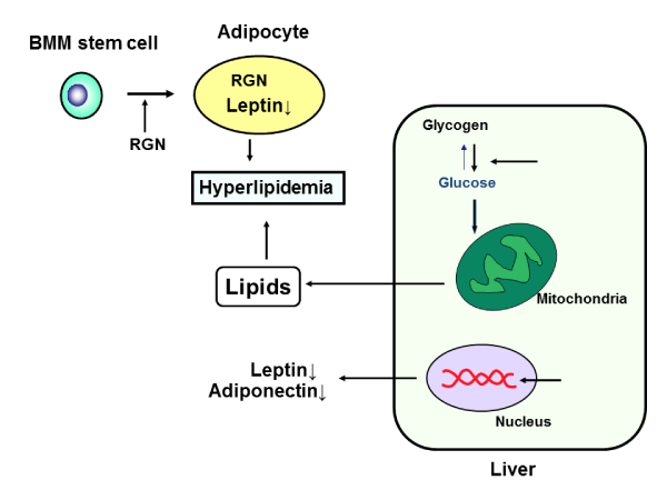 Figure 1. Role of regucalcin (RGN) in the regulation of lipid metabolism and implication with obesity and diabetes. RGN stimulates differentiation from bone marrow mesenchymal (BMM) stem cells to adipocytes, and it enhances adipogenesis and enhances triglyceride in the adipocytes. RGN suppresses leptin expression in adipocytes that regulate feeding. RGN stimulates glycolysis and production of in the liver cells, and it suppress adiponectin and leptin mRNA expression in the liver cells.