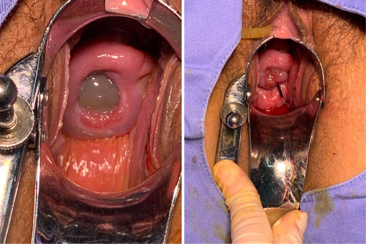 Figure 1. (A) Protrusion of the amniotic sac through the cervical os before cervical cerclage in a patient with cervical insufficiency. (B) Cervical condition after McDonald cervical cerclage