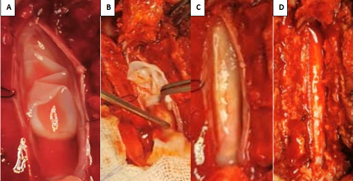 The patient underwent laminoplasty Th 4, 5 and 6 guided by fluoroscopy, the epidural space was free. After opening of the dura, a translucid cyst appeared underneath the arachnoid layer covering the posterior aspect of the cyst which is covering the cord. After peeling away the arachnoid, the 2 poles of the cyst were identified and a dissection was accomplished easily. The cyst was initially aspirated and clear fluid like CSF came out, surprisingly after that, the cyst wall became thick and whitish (Figure 2), fastly, reminded us the HC features, so we immediately considered as such; after removing it in one piece, which is very difficult in the AC. The surgical field was irrigated with 3% saline. After ensuring hemostasis, the dura was closed watertigthly and the laminas were fixed with vicryl suture (Figure 2).