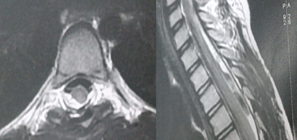 An 11-years-girl presented with history of thoraco-intercostal radiculalgias, bilateral low limbs weakness concomitant to bladder and bowel disability. Neurological examination revealed severe paraparesis with power 3/5 in left side and 4/5 in right one, with loss of autonomic ambulation. Lower limbs tendon reflexes were exaggerated with bilateral Babinski reflexes. There was no sensory loss.
