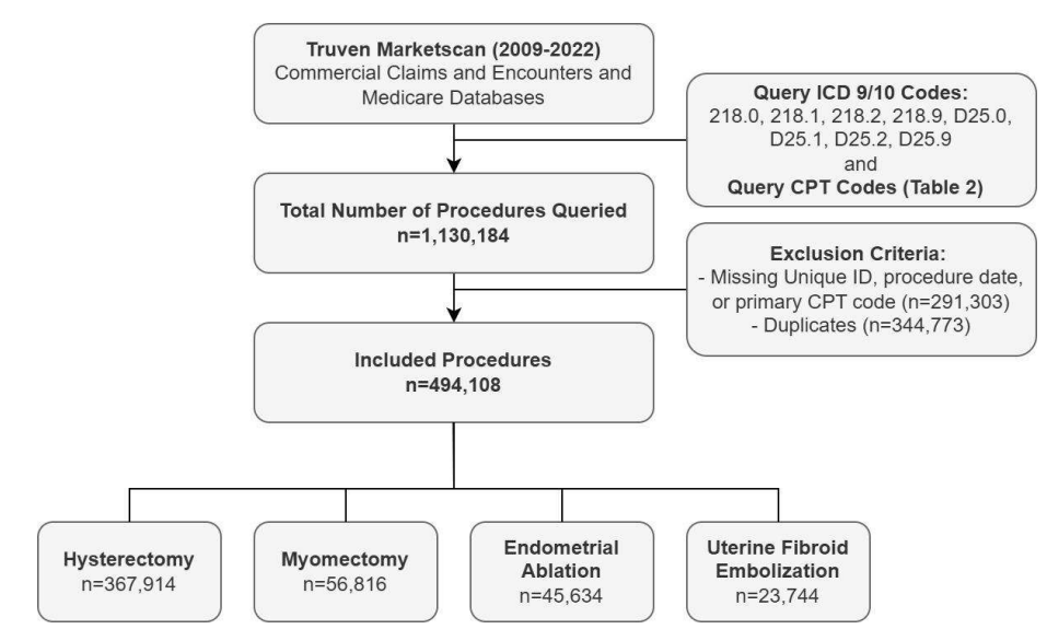 The Ninth and Tenth Revisions of International Classification of Diseases (ICD -9/10) and Current Procedural Terminology (CPT) coding systems were used to find patients with a fibroid diagnosis and identify the corresponding treatment procedure. Patients were then excluded from the cohort if there was no information related to their unique enrollee ID and service date. To filter out duplicate entries, patient encounters with the same enrollee ID, service date, and procedure CPT code were filtered out, meaning that only the first unique patient encounter was included. Patients were subsequently filtered and grouped by uterine fibroid treatment modality (myomectomy, hysterectomy, endometrial ablation, or UFE) using the corresponding CPT codes (Table 2, Figure 1). Being a retros pective cohort study, sample size was not pre-determined and was a result of the described data extracti on process and application of exclusion criteria.