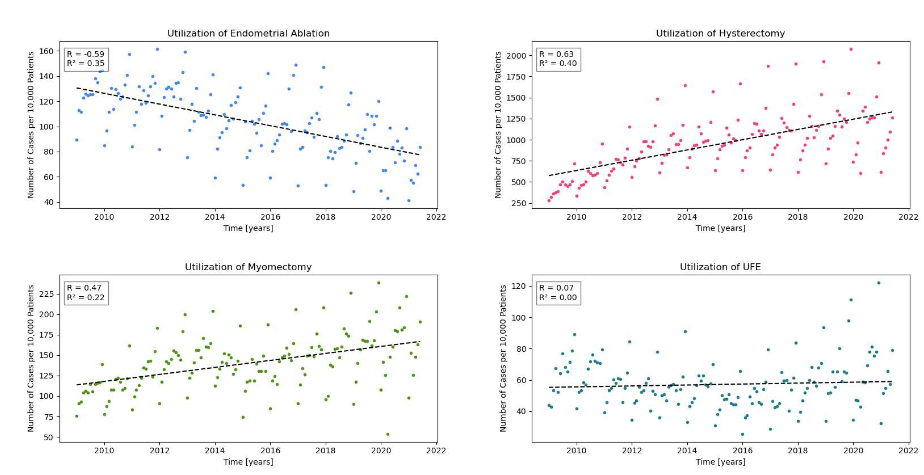 Results: There were a total of 407,487 unique patients who had a diagnosis of uterine fibroids and had a procedure of interest between January 2009 through June 2022 in both the inpatient and outpatient settings before applying exclusion factors. Querying patients with an ICD9/10 code of symptomatic fibroids, there was an average of 27,278 patients who carried a fibroid diagnosis per month. The study cohort consisted of 407,487 unique patients with a mean patient age of 44.93 (±7.13) who underwent a total of 494,108 procedures. Hysterectomy had the highest utilization rate overall followed by endometrial ablation, myomectomy, then UFE. From 2009 through 2020, yearly post-hoc Tukey's HSD tests consistently revealed significant differences in utilization rates when com paring hysterectomy against endometrial ablation, myomectomy, and UFE. In order of most to least number of procedures performed, hysterectomy was first, which accounted for 367,914 procedures, followed by endometrial ablation (n=45,634), myomectomy (n=56,816), and uterine fibroid embolization (n=23,744). During the study period, there was a steady increase utilization in hysterectomy (R=0.63, R2=0.4) and of life as the hysterectomy patient myomectomy (R=0.47, R2=0.22). There was no significant trend in the utilization rates of UFE, and endometrial ablation shows a moderately negative association (R=0.59, R2=0. 35).