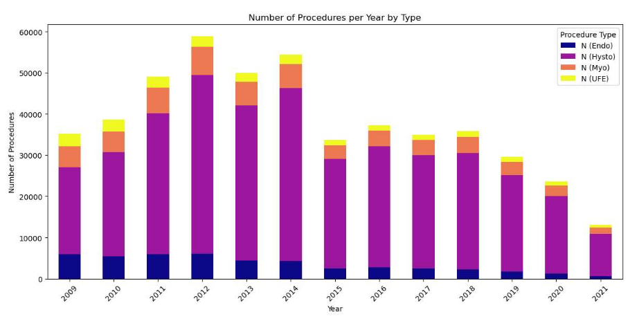 Study design: Data from the Merative MarketScan Commercial Claims and Encounters Databases were analyzed from 2009 to 2022 for patients who were diagnosed with uterine fibroids. Patients were Identified by ICD-9/ICD-10 codes and categorized by procedure based on CPT codes. Utilization rates were calculated per 10,000 patients with fibroid diagnoses. A repeated measure ANOVA was conducted (p < 0.0001) for each year followed by Tukey's HSD tests with Bonferonni correction.