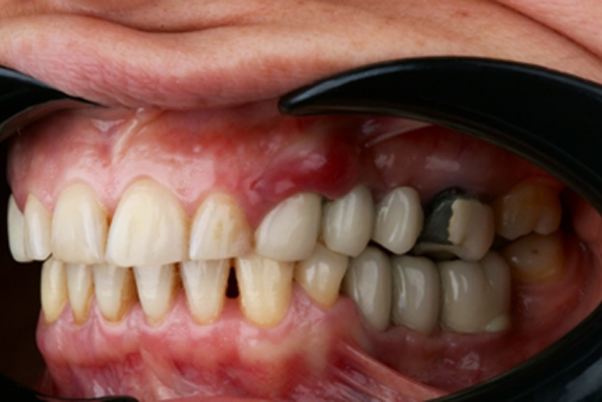 Figure 1. Presenting clinical photograph showing suppuration and increased volume in Quadrant III associated with a bridge on implants from Tooth 35 to 37