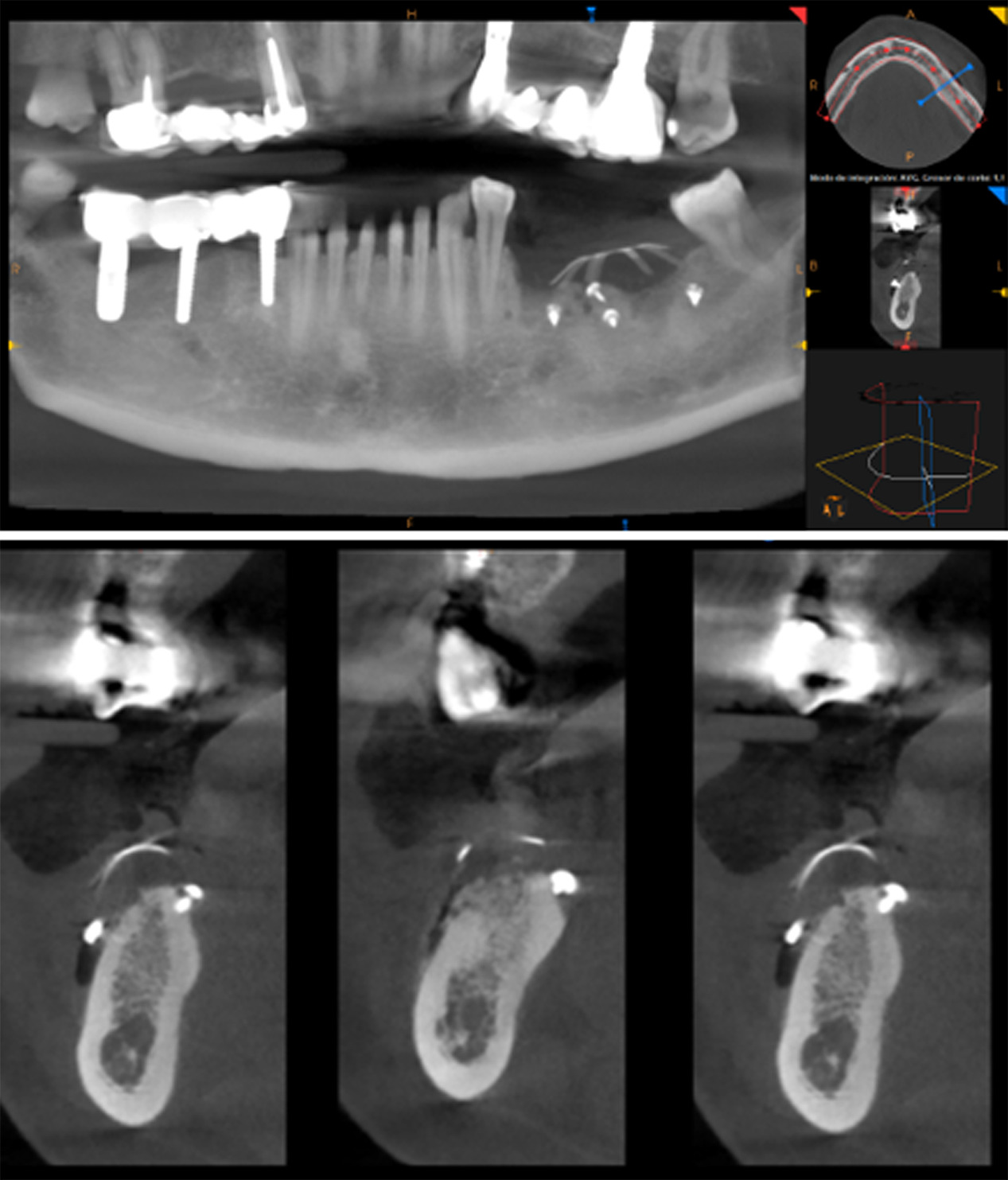 A female patient in her 40s presented with suppuration of increasing volume in Quadrant III and reported a 5-year pain-free progressive evolution. The patient was otherwise asymptomatic with no pertinent family or medical history. Clinical examination revealed association of the suppuration with a bridge on implants from Tooth 35 to 37 (Figure 1) and radiographic examination confirmed bone loss characteristic of moderate peri-implantitis (Figure 2). It was thus determined that the original implants would be removed, followed by GBR to facilitate proper three-dimensional placement of new implants.