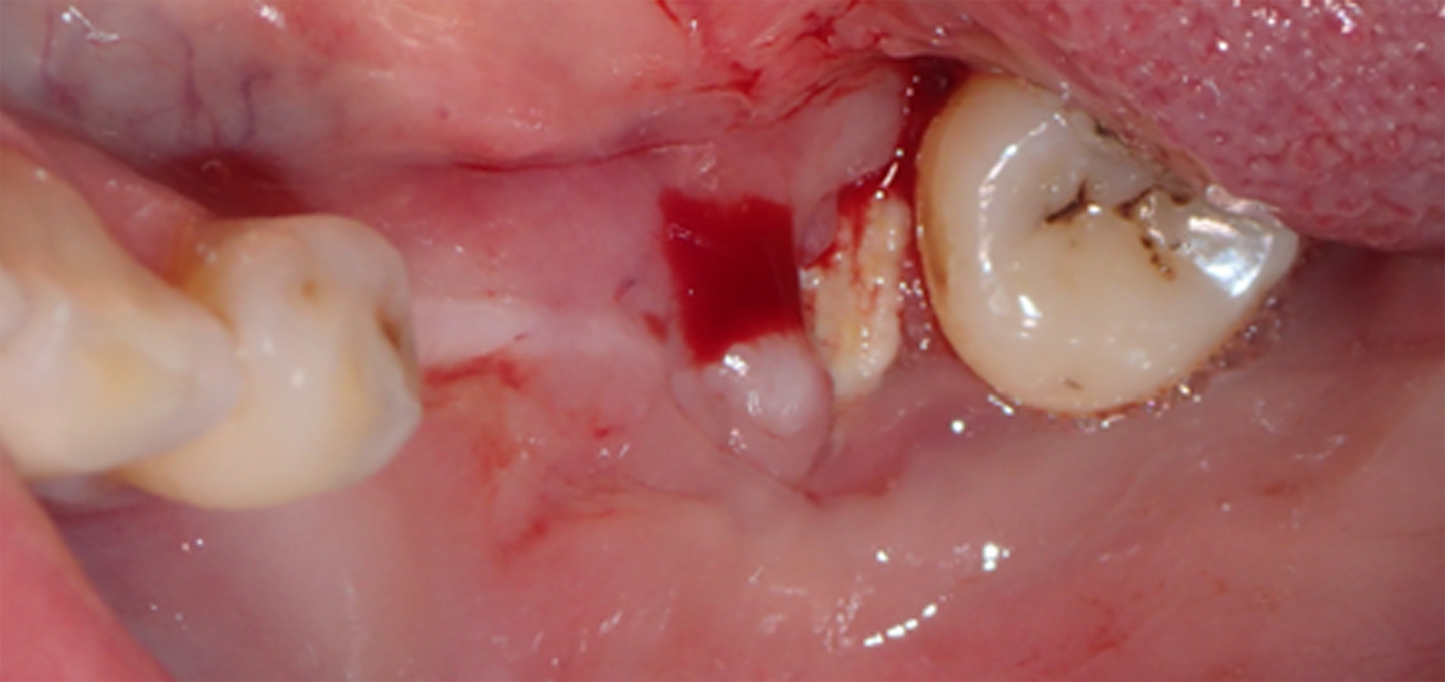 Figure 11. At 3 months postoperative, the patient returned to the office presenting with an area of distal titanium-reinforced membrane exposure adjacent to Tooth 38, without pain, but with bleeding, swelling, and discoloration