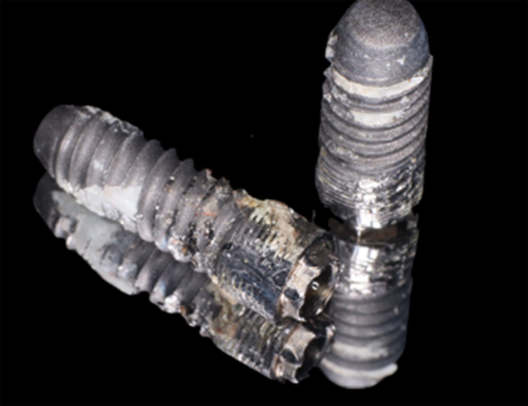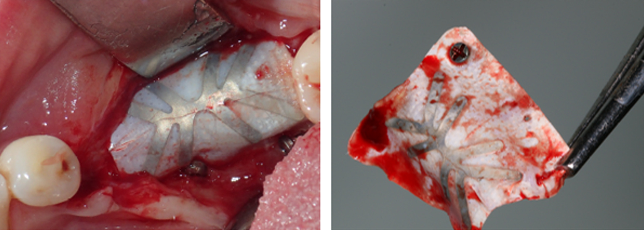 Following removal of the implant bridge and creation of a full-thickness flap, vertical and horizontal bone engagement around the original implants was confirmed with an active infection in progress (Figure 3). Both implants were explanted (Figure 4) with subsequent curettage of the bed and application of a local antibiotic (clindamycin).