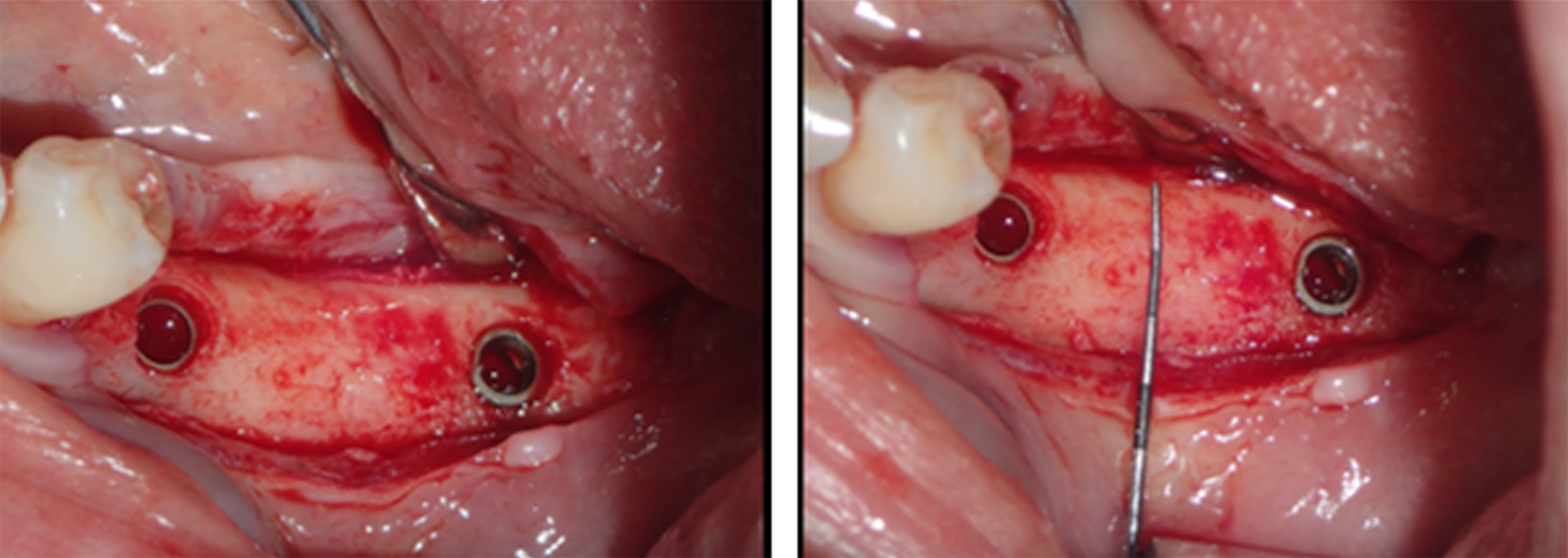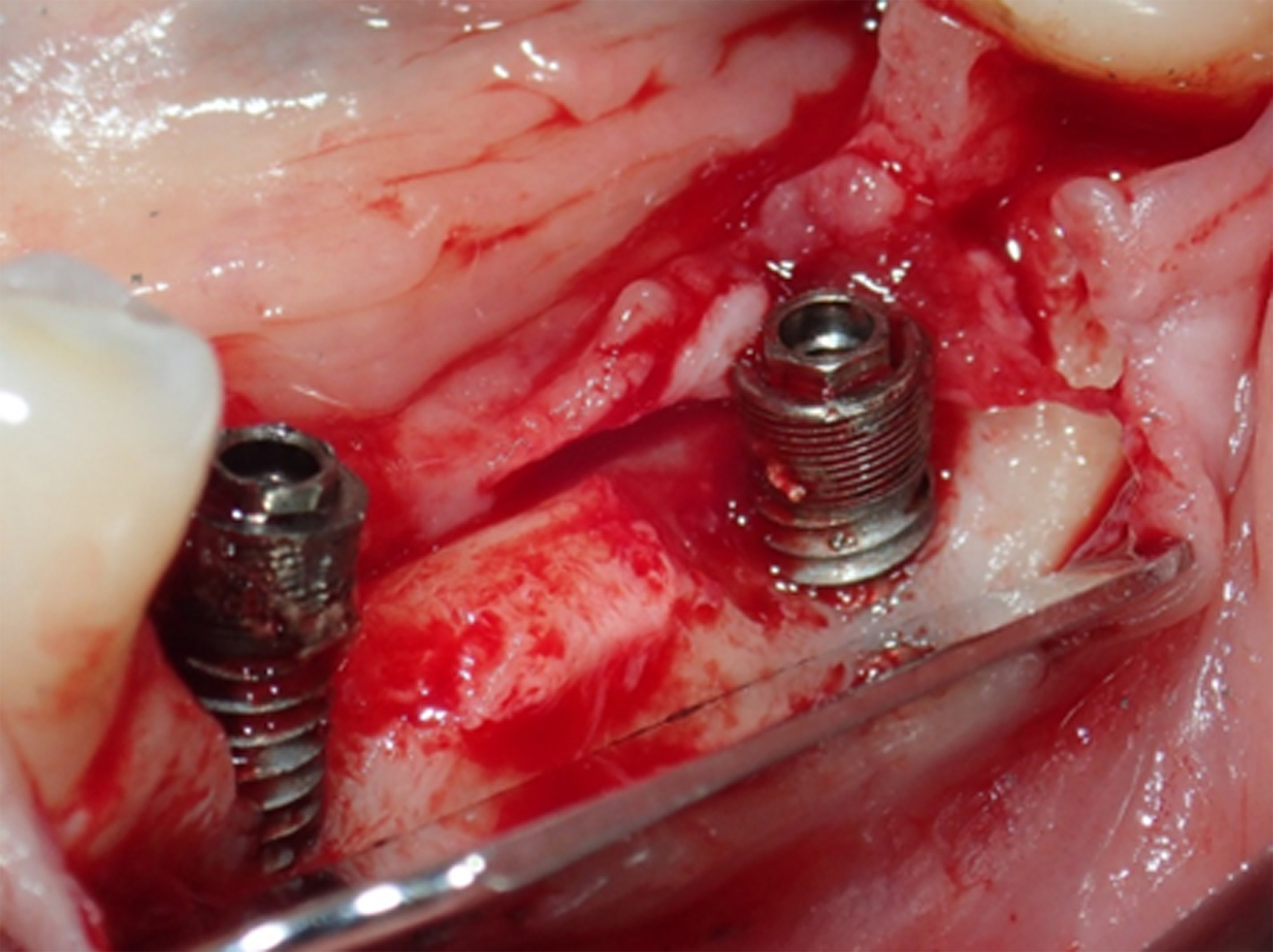 Figure 3. After removing the implant bridge and creating a full-thickness flap, vertical and horizontal bone engagement around both implants was confirmed with an active infection in progress