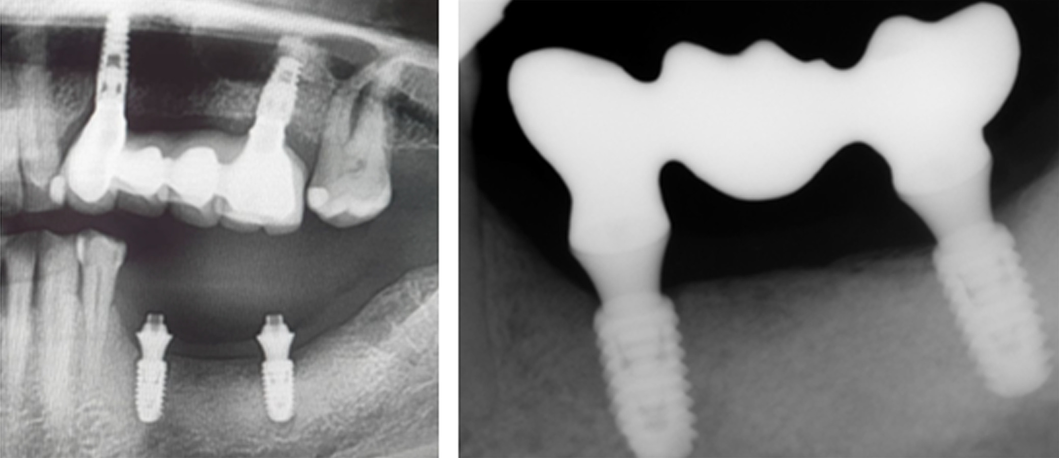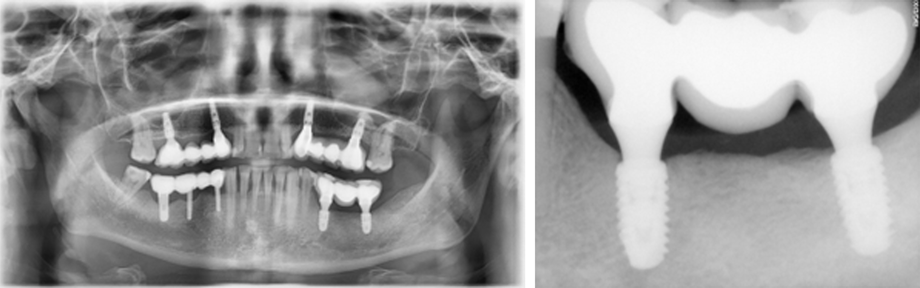 Figure 19. [Left] Panoramic and [Right] periapical radiographs at 24 months postoperative showing healthy bone regeneration and ideal placement of the implants and bridge from Tooth 35 to 37