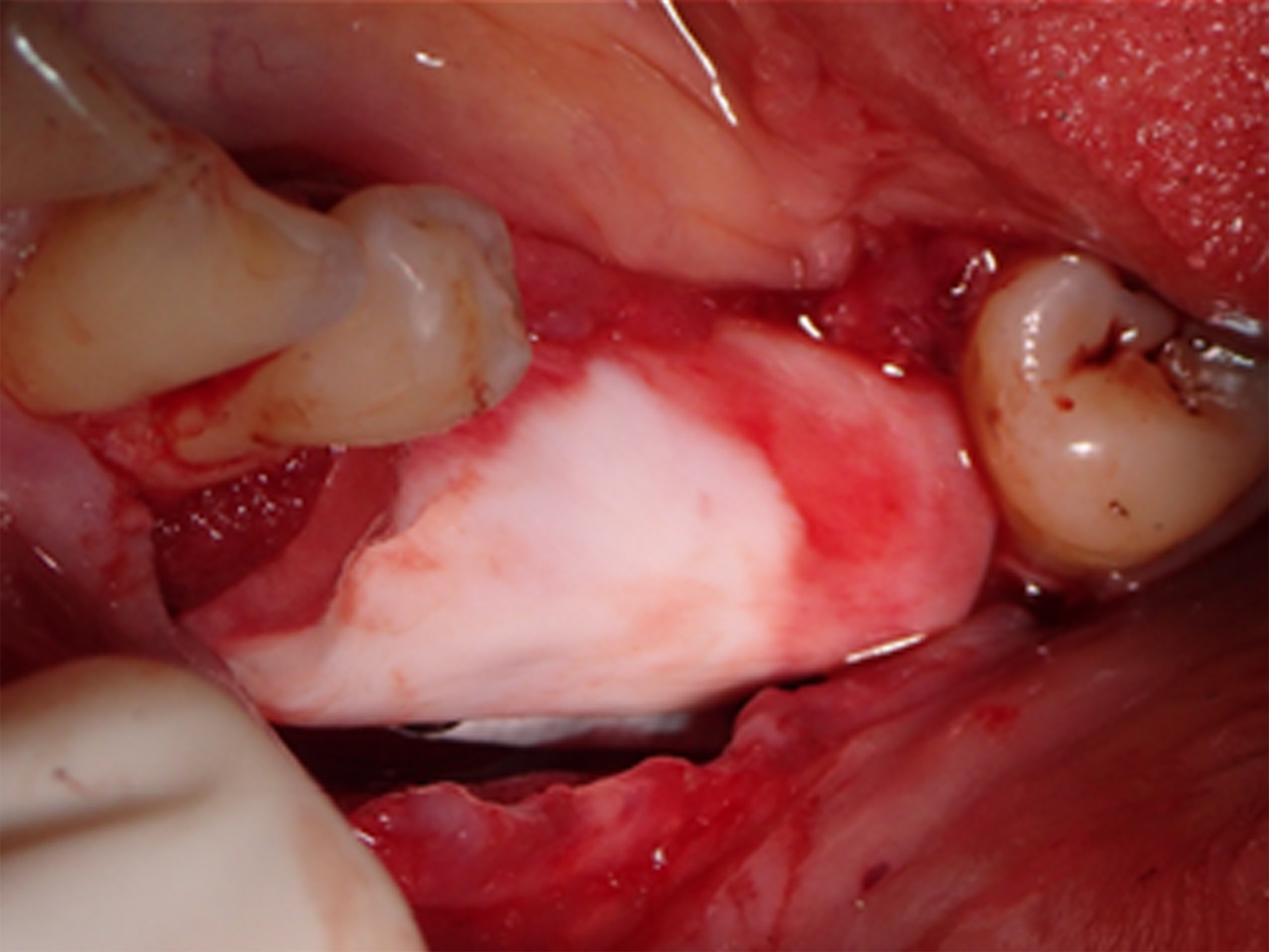 Figure 6. Guided bone regeneration was first facilitated through a combination of C/C Mix and autograft obtained from the mandibular ramus