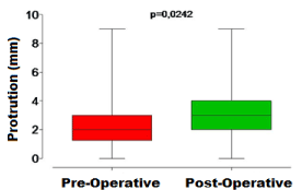 Protrusion also increased significantly (Wilcoxon Test, p<0.05), as observed in Graphic 3. During the pre-op, the protrusion average (± Standard Deviation) was of 2.3 ± 1.8 mm, increasing to 2.8 ± 1.65 mm in the post-op (average increase of 0.5 ± 1.56 mm) (Figure 11).