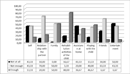 Time that parents spend in activities of everyday life: Of all parents, the 43.33% spends "not at all" time on themselves, the 43.33% "not enough" and the 13.33% devotes "enough" time to themselves (Figure 1). For the time about the relationship with the partner, as a couple, the 70% of the parents responded "not enough". For the time with the family the 50% of the parents responded "not enough" and the remaining 50% "enough". For the child's rehabilitation activities, the 80% of parents dedicate "enough" time. In addition, the 46.67% of parents dedicate "enough" time to play with their child. As for the time about friends, the 63.33% of parents responded "not enough". Finally, the 50% of parents devotes "not at all" time to their entertainment.