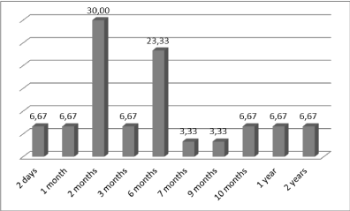 Time to realize the possible consequences of diagnosis: The 40% of parents realized the possible consequences of diagnosis "after two months", the 26.67% of parents "immediately", the 20% "in less than one year", while the 13.33% "after one year".