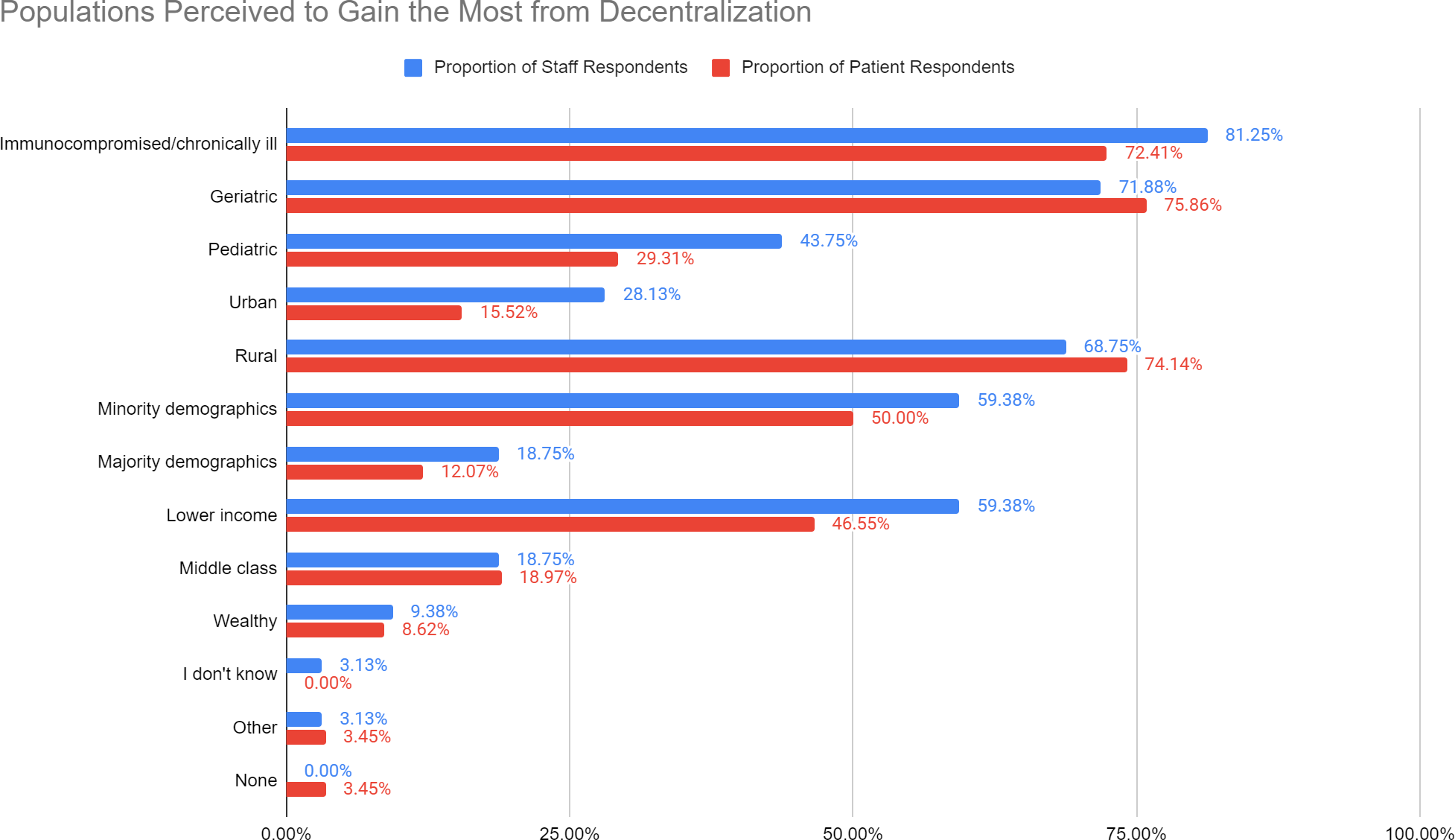 In response to the question, “Which participant populations do you think stand to gain the most from decentralization,” of the complete staff survey submissions, most staff respondents (81.25%) answered that “Immunocompromised/chronically ill” populations will benefit most from decentralization (Figure 1). Of the complete participant survey submissions, most participant respondents indicated that “Geriatric” (75.86%) and “Rural” (74.14%) populations will benefit the most.