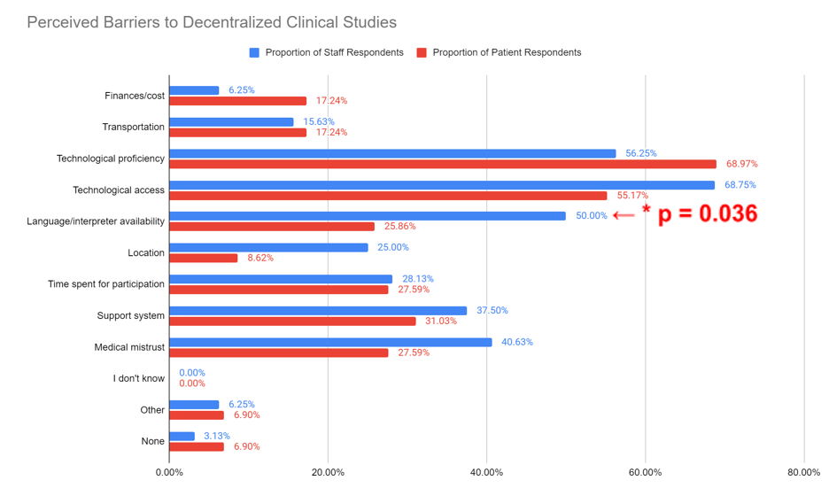 Figure 3. Staff and participant responses regarding barriers to participation in decentralized clinical studies. Analysis of staff and participant responses to the question, “What barriers do you foresee preventing participant enrollment in decentralized research studies (including hybrid DCT)?” Answers included finances/ cost, transportation, technological proficiency, technological access, language/interpreter availability, location, time commitment, support system, medical mistrust, “I don’t know”, “Other” and “None”. Answers were stratified by staff (blue) and participants (red) with response rates included. A statistically significant difference was identified between the proportion of staff and participants that selected “Language/interpreter availability” (p=0.036)