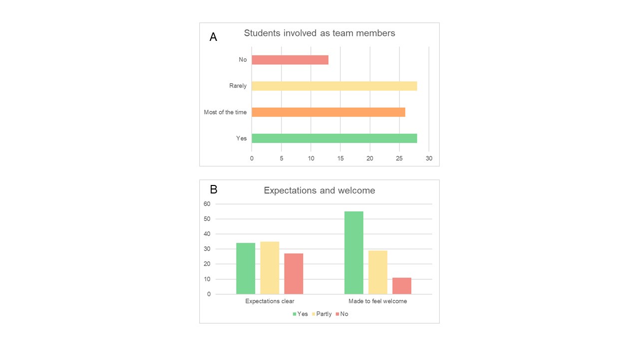 Figure 2 A/B. Students perception of team involvement, welcome and an understanding of expectations at the start of the rotation