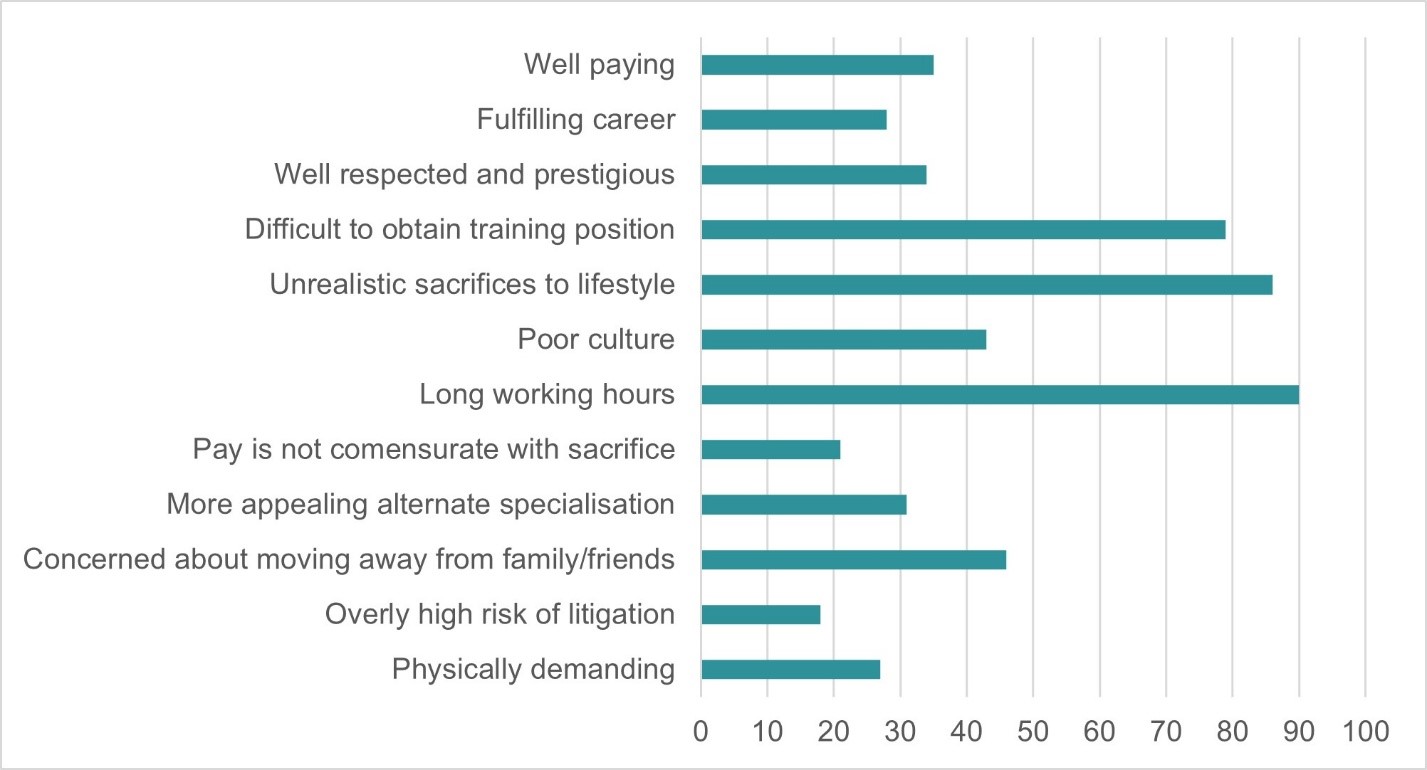 Attitudes towards pursuing a career in surgery after surgical rotation were assessed. Factors that improved a student’s perception of a career in surgery included spending time in theatre, handling instruments during procedures, receiving anatomy tuition during procedures, reviewing patients independently in the emergency department or outpatient clinics, and performing bedside procedures such as suturing, intravenous cannulation, phlebotomy, and placement of indwelling catheters. Respondents consistently reported that experiences were enhanced when expectations were clear, dedicated teaching time was provided, they were made to feel part of the team, and when supervisors were responsive. The factors associated with dissuading students from a career in surgery were perceived as long working hours, impact on personal time outside of work, difficulty in gaining a training position, and poor work culture (Figure 3).