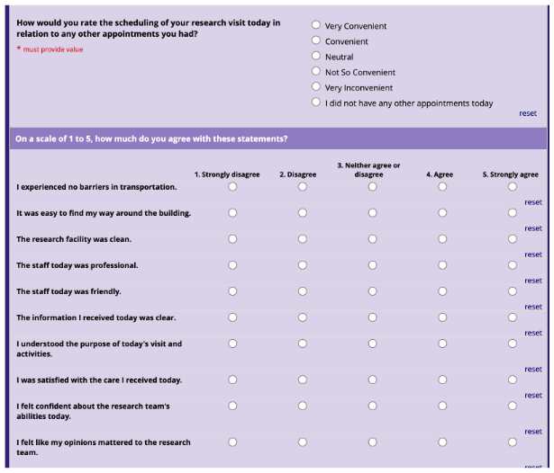 To build the survey we conducted a literature review to understand current practices and frameworks related to research participant experience. Additionally, the NYU Langone Health Press Ganey Outpatient Services Survey, routinely administered to ambulatory patients by many hospital systems, served as a foundation [14,15]. Our survey design was informed by prior work applying service-based frameworks to clinical settings, such as Lee et al. [4], and by the HSQM developed by Brady et al. [12]. This model evaluates service quality across three key dimensions: participant-staff interactions, the physical environment, and perceived care quality.