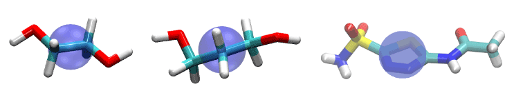 Figure 1.Ligands of this study: EDO (left), PDO (center), and AZM (right). They are represented as licorices colored by atom names: hydrogen, white; carbon, cyan; oxygen, red; nitrogen, blue; sulfur, yellow. The purple bubbles indicate the pulling center of each ligand.