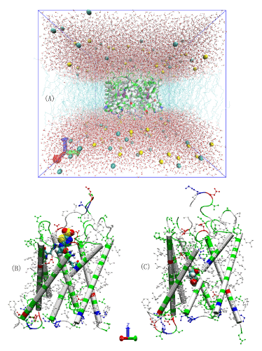 We took the high-resolution crystal structure of AQP4 (PDB code: 3GD8) [8], embedded the tetramer in a 120 x 120 Å2patch of POPE bilayer, added a 30 Å-thick layer of waters to each side of the membrane patch, and salinated the system to an NaCl concentration of 150 mM. In this way, we obtained a pure AQP4 tetramer-membrane system consisting of 150,951 atoms without any ligands that can bind to AQP4. After the initial optimization and 50 ns equilibrium molecular dynamics (MD) run, the system settles down to dimensions of 115.3×112.6×110.6 Å3. This all-atom model system is similar to typical MD studies of AQPs in the current literature [50-55] pioneered in Ref. 4. In all MD production runs, we fixed the alpha carbons on the helices that are within the ±10 Å range from the central plane of the membrane to fully respect the crystal structure. Figure 1(A) illustrates the equilibrated system with one PDO in each AQP4 monomer.