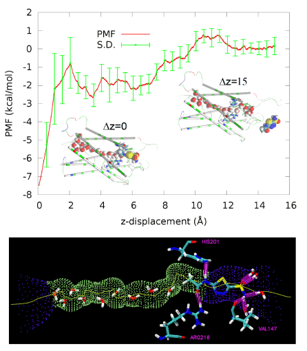 Figure 3.PMF along the dissociation path of pulling AZM from the binding site in the channel entry vestibule to the extracellular bulk.Inset Δz=0 (also drawn in the right panel) shows AZM at the binding site. Inset Δz=15 shows AZM in the extracellular bulk away from the protein. Protein is represented as cartoons colored by residue types. Waters inside the AQP4 conducting channel and AZM are shown as large spheres colored by atom names (hydrogen, white; oxygen, red; carbon, cyan; nitrogen, blue; sulfur, yellow). In the bottom panel, the AQP4 channel is illustrated as the purple-green-purple dotted pipe threaded with a yellow line. Three residues, His 201, Arg 216, and Val 147, form three hydrogen bonds with AZM. Also shown are waters inside the channel or hydrogen-bonded to AZM. All these waters, AZM, and the three residues are represented in licorices colored by atom names.