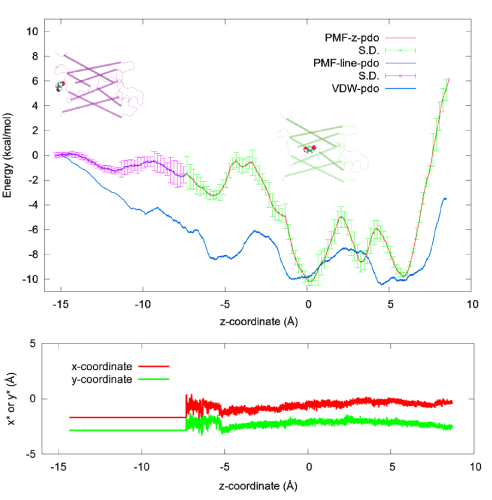 Figure 4.PDO-AQP4 binding characteristics. Top: The 1D PMF of PDO (red line with green error bars) as function of the z-coordinate of its center of mass vs the 3D PMF of PDO (blue line with purple error bars) along a line leading from the one chosen state to the corresponding dissociated state in the cytoplasmic bulk.Two insets of PDO (spheres)-AQP4 (cartoons) illustrate PDO bound inside the channel and PDO outside the channel respectively. Bottom: The x- and y-coordinates of the PDO center of mass along the pulling path. The x- and y-coordinates fluctuate freely inside the channel region where the 1D PMF was computed but they are not allowed to fluctuate along the partial path on which the 3D PMF was determined. Also plotted in the top panel is the vdW energy (blue line without error bars) between PDO and AQP4 as a function of the z-coordinate of the PDO center of mass, which was the result of time-coarse-graining a PDO trajectory.