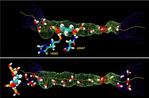 Figure 6.Hydrogen bonds.PDO inside (top panel) and outside (bottom panel) the AQP4 water channel. The channel is illustrated as the blue-green-red-green-blue pipe. PDO is shown as large spheres. Waters and residues His 95 and Asn 97 are shown as licorices. Colors: oxygen in red, carbon in cyan, nitrogen in blue, and hydrogen in white. The hydrogen bonds between PDO and protein residues/waters are shown as yellow springs.