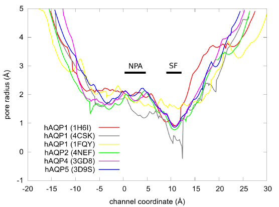 Figure 7.The pore radii of the human AQPs obtained from the PDB coordinates (PDB code: 1H6I, 4CSK, 1FQY, 4NEF, 3GD8, and 3D9S) using the HOLE program [59]. The ar/R selectivity filter and the NPA motifs are marked by SF and NPA bars respectively.