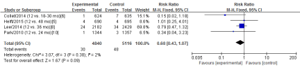 Four RCTs [5-6,8,10] in this meta-analysis provided data on the rates of major bleeding. No Significant heterogeneity was detected between these studies (Chi2=3.07, df=3; P=0.38; I2=2%). The combined estimate for the rates of major bleeding based on the fixed-effects model showed no statistically significant difference between the S-DAPT group and the L-DAPT group(9956 patients; FEM; RR=0.68; 95%CI, 0.43 to 1.07; Z=1.67; P=0.09) (Figure 8).