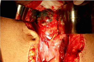 Figure 2. Retroperitoneal open and and blue dye in paraaortic nodal