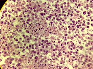 Figure 4. metastastasis nest with light cytoplasma, promient nucleoli, and central nucleus, case 2