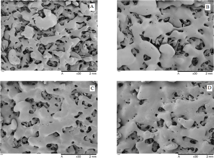 Figure 1. Surface micrographs of pure PCL and PCL/FU tablets sintered using different power conditions: PCL 3W (A), PCL 7W (B), PCL/FU 3W (C), and PCL/FU 7W (D).