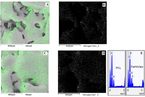 Figure 2 shows the micrographs of the PCL/FU tablets with the EDS nitrogen atom contrast and nitrogen chart. The EDS Nitrogen contrast for the PCL/FU tablets shows the presence of small particles of fluorouracil distributed throughout the polycaprolactone matrix. The EDS analysis revealed the proportion of carbon, oxygen, nitrogen and fluorine atoms present in the PCL matrix and in the FU particle composition (Figure 2 E) and confirmed the presence of fluorouracil dispersed throughout the porous PCL matrix.