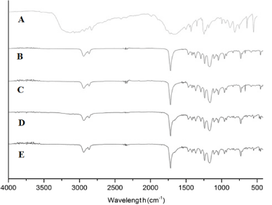 Figure 3. FTIR-ATR spectra for fluorouracil (A), pure PCL and PCL/FU tablets sintered using different power conditions: PCL 3W (B), PCL 7W (C), PCL/FU 3W (D), and PCL/FU 7W (E).
