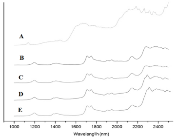 Figure 4. Near-FTIR spectra for fluorouracil (A), pure PCL and PCL/FU tablets sintered using different power conditions: PCL 3W (B), PCL 7W (C), PCL/FU 3W (D), and PCL/FU 7W (E).
