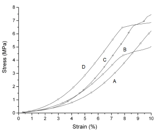 Figure 6. Flexural test curves of pure PCL and PCL/FU tablets sintered using different power conditions: PCL 3W (A), PCL 7W (B), PCL/FU 3W (C), and PCL/FU 7W (D).